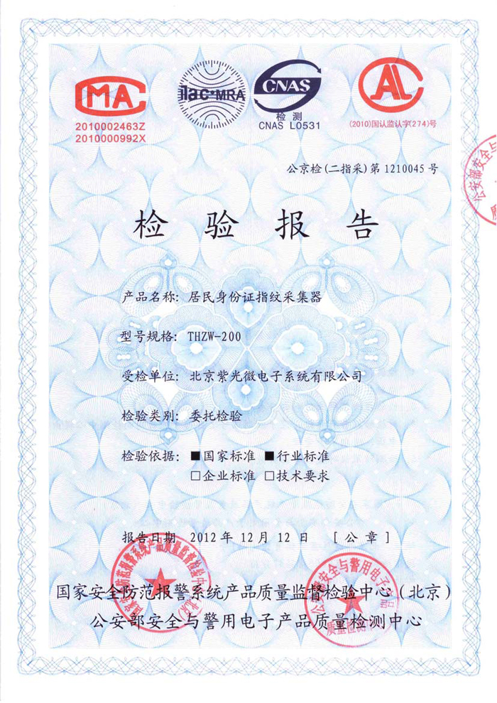 公司THZW-200型光学指纹采集器通过公安部安全与警用电子产品质量检测中心的检测