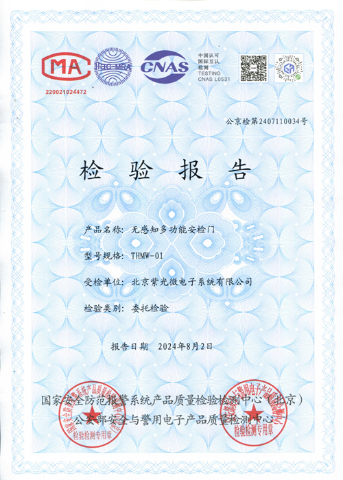 紫光微电子 “无感知多功能安检门THMW-01通过《公安部安全与警用电子产品质量检测中心》的检测”