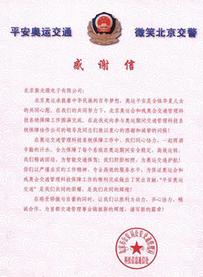 北京市公安局公安交通管理局鉴于紫光微电子在29届北京奥运会和残奥会中圆满完成北京市交通科技系统的保障工作,发感谢信,予以表彰